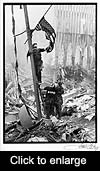 The huge pile of debris that had been the World Trade Center and the heavily damaged buildings on the perimeter created a feeling that was reminiscent of standing inside a huge crater. The still-smoldering “Pile” completed the volcanic-like scenario. I looked up at One Liberty Plaza on the corner of Liberty