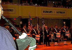 Emerald Society Pipe Band filled the hall at the Hilton Hotel as First Deputy Commissioner Patrick Kelleher stood at attention. They played in tribute to a man who has
