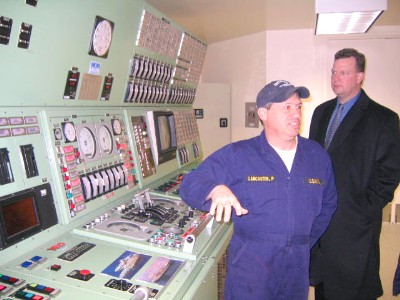 Chief Engineer Patrick Lancaster explains the Simulated Engine Room. Det Edward M Reuss, NYPD (Retired) in background.